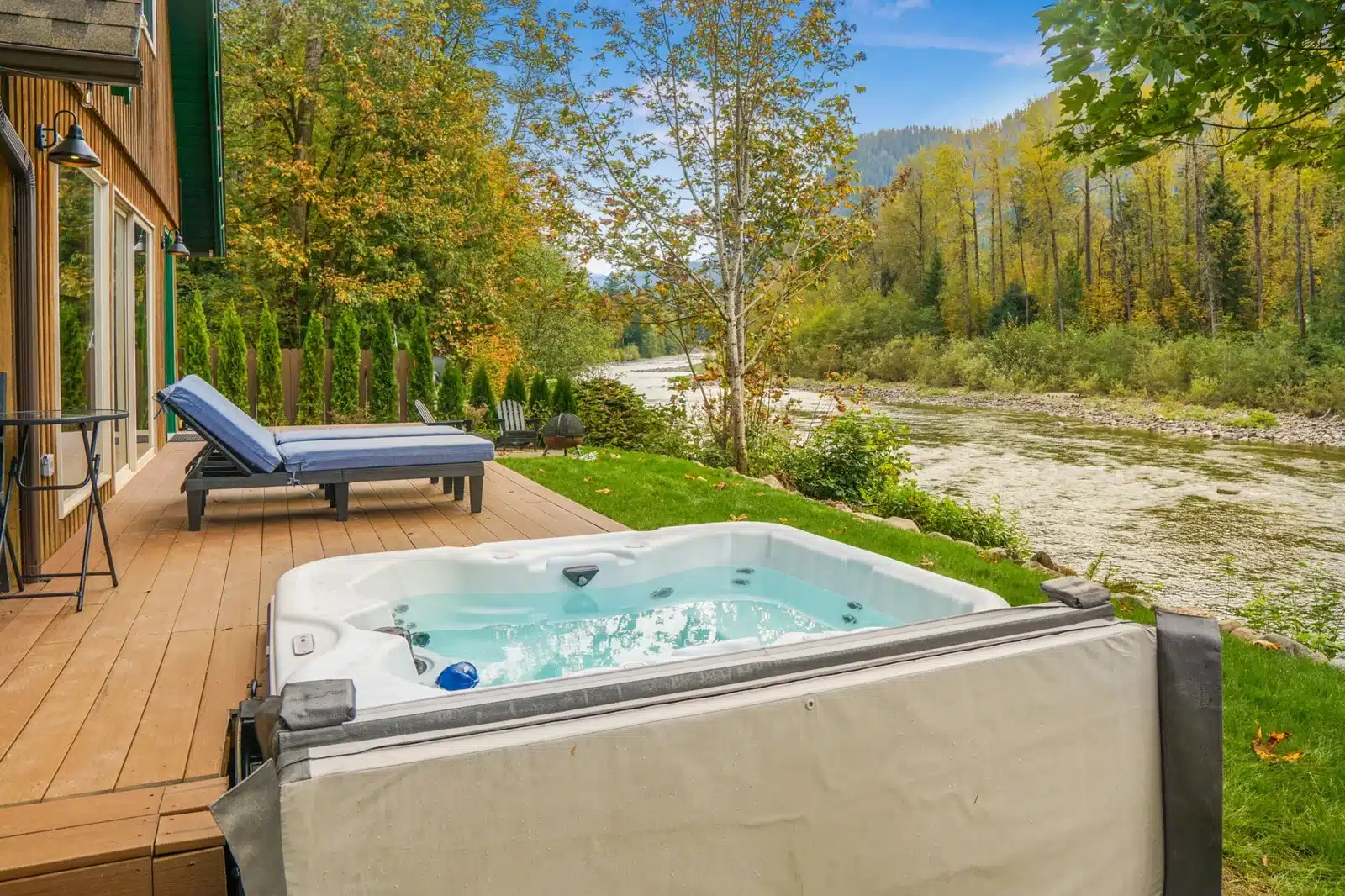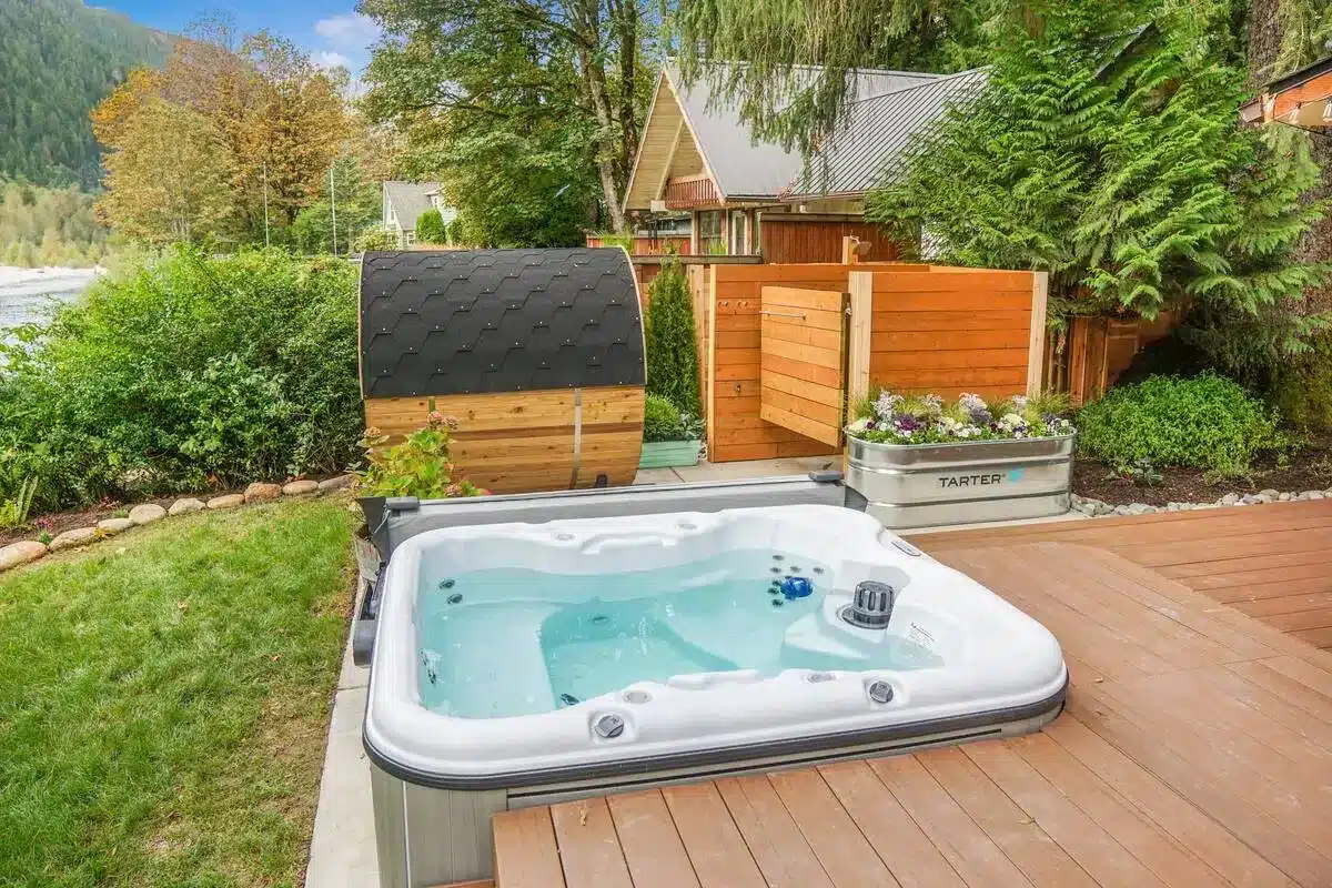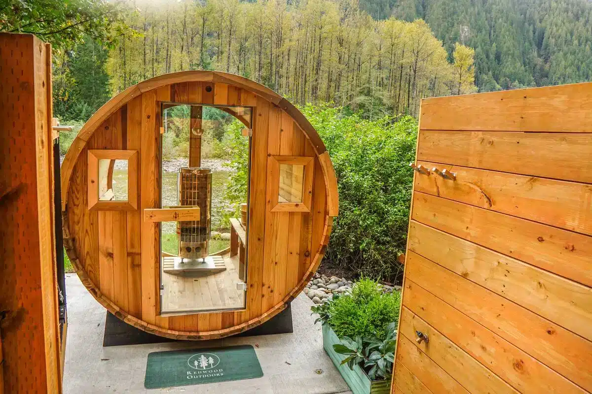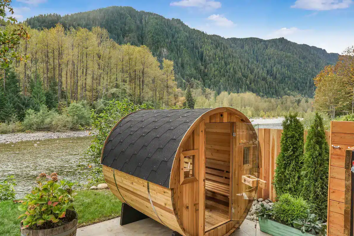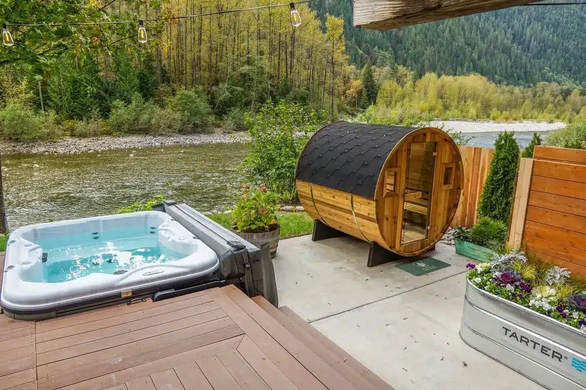 The Gateway Cabin on the river offers a serene getaway with a private sauna and hot tub, providing a perfect blend of relaxation and nature. Situated along the riverbank, guests can unwind in the warmth of a sauna, ideal for soothing sore muscles after a day of outdoor activities. The hot tub, set just steps from the river, invites guests to soak under the open sky while listening to the gentle flow of the water. Whether it’s a cozy retreat or a romantic escape, the sauna and hot tub at this riverside cabin deliver a peaceful and rejuvenating experience amid scenic natural beauty.